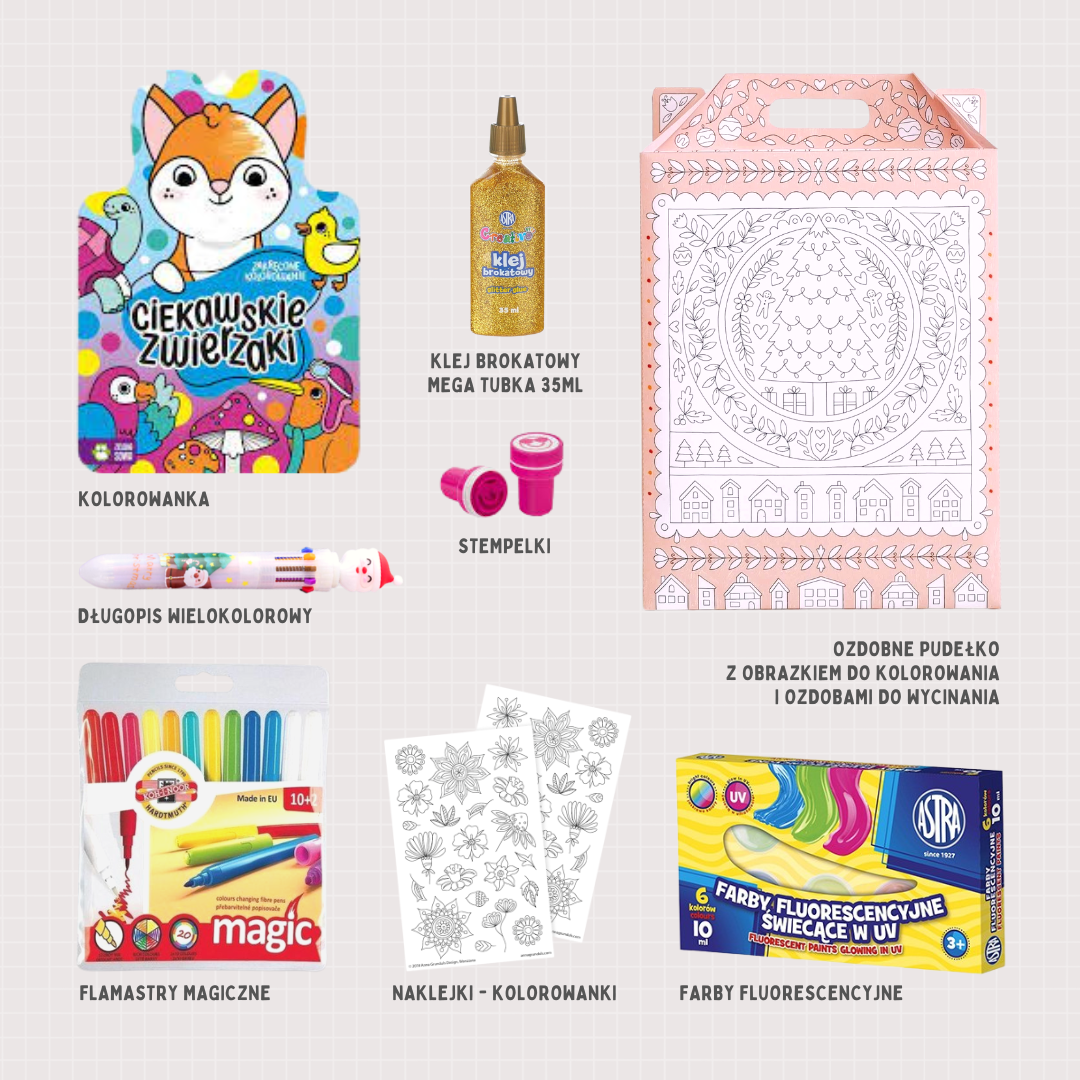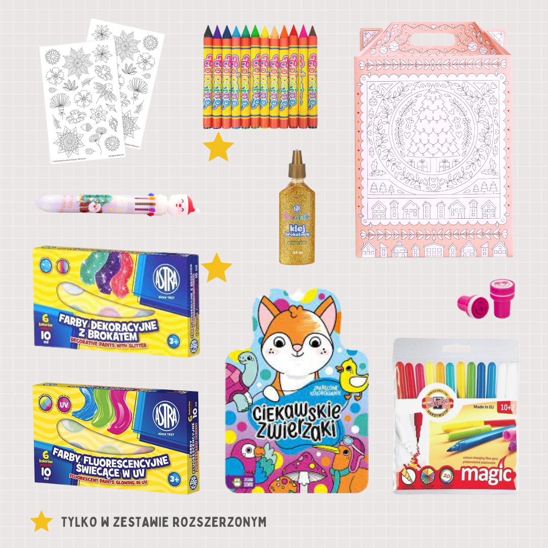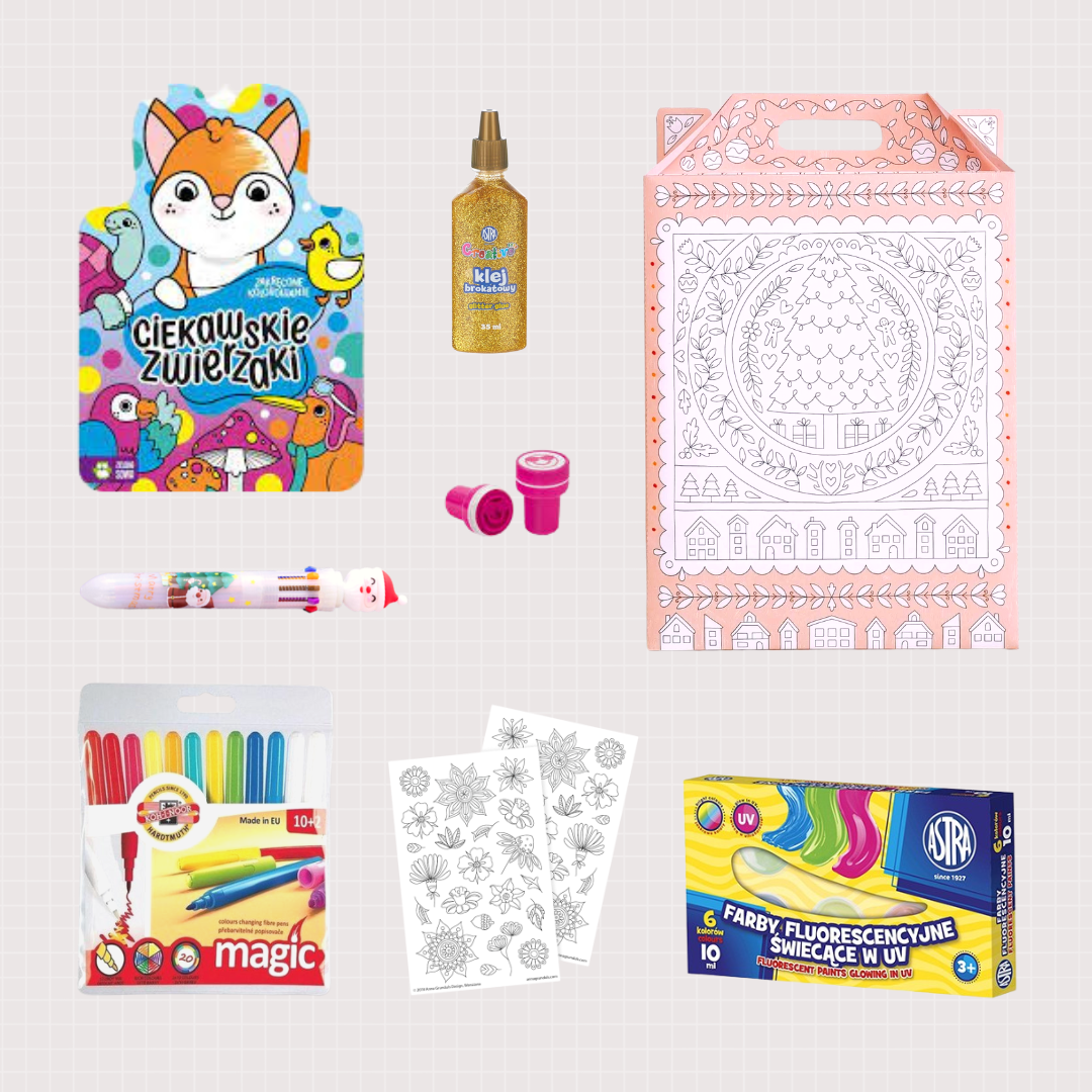 Zawartość zestawu możemy skomponować i zmieniać według potrzeb. Zdjęcie w ofercie przedstawia zestaw przykładowy, jednak zawartość zależy od dostępności poszczególnych produktów. Na przykład: Kolorowanka może zostać zamieniona na inny wzór z tej samej serii. Produkty dobierane są w taki sposób, żeby tworzyły ze sobą spójną całość i atrakcyjnie prezentowały się jako zestaw.
