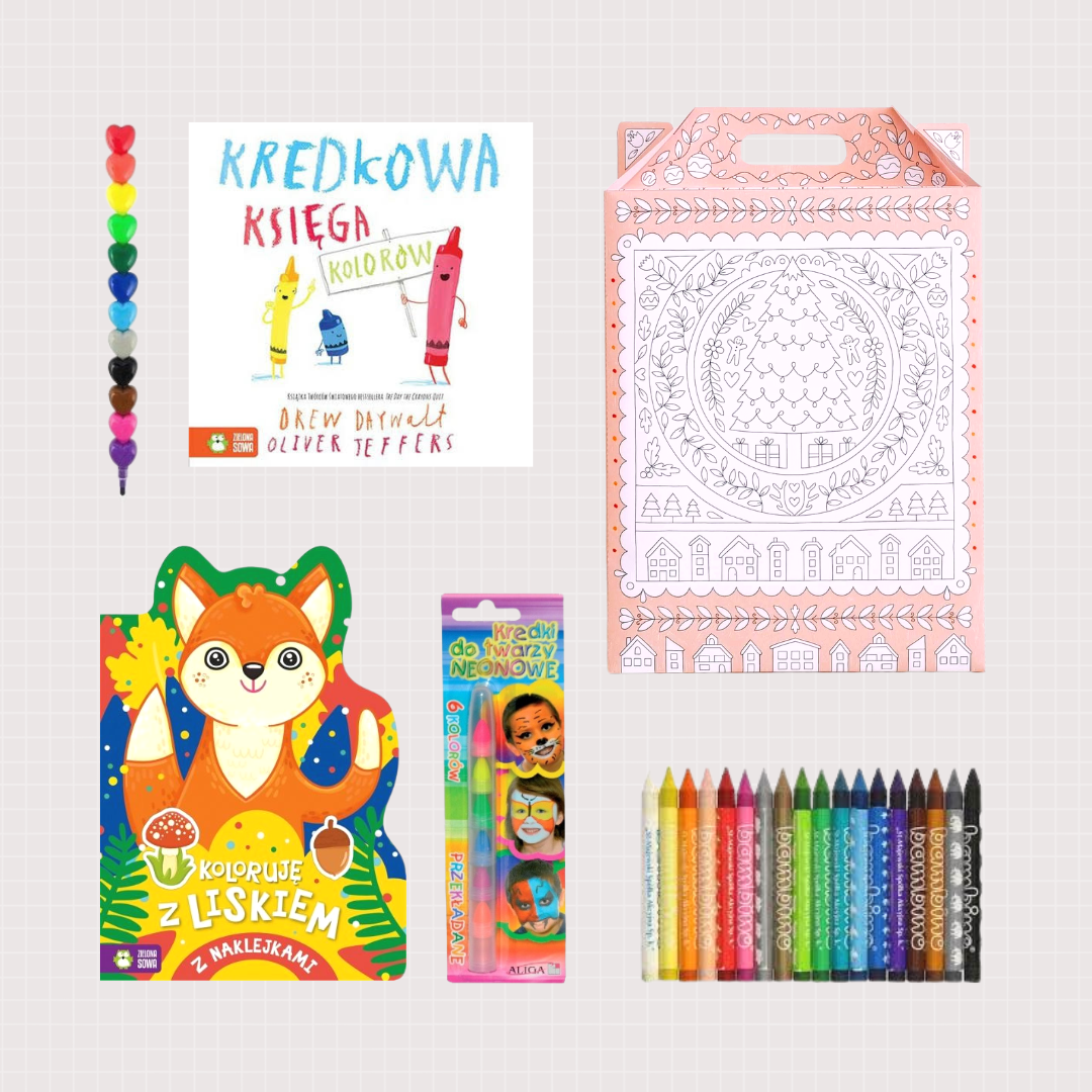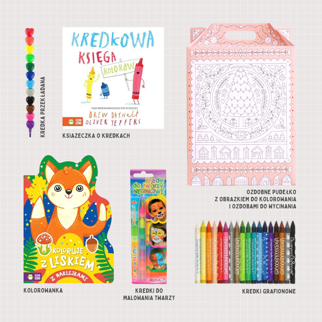 Zawartość zestawu możemy skomponować i zmieniać według potrzeb. Zdjęcie w ofercie przedstawia zestaw przykładowy, jednak zawartość zależy od dostępności poszczególnych produktów. Na przykład: Kolorowanka może zostać zamieniona na inny wzór z tej samej serii. Produkty dobierane są w taki sposób, żeby tworzyły ze sobą spójną całość i atrakcyjnie prezentowały się jako zestaw.